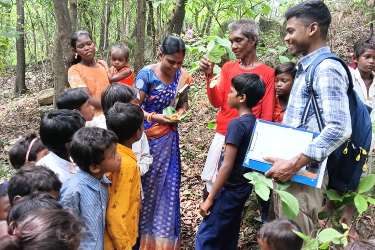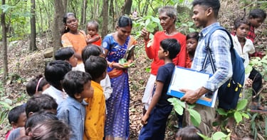 Our two fellows, Namita Sabar and Satyajit Sabar with children on awareness of Uncultivated Wild Food