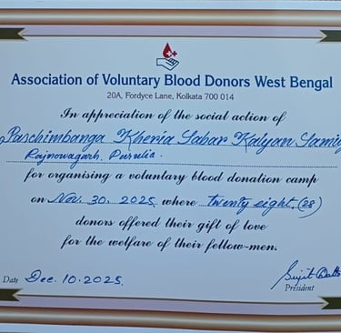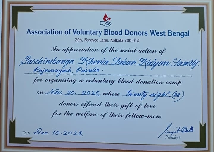 The District Authority, including the MSVP, and the Authority of Association of Voluntary Blood Donors West Bengal highly appreciated this historic initiative and acknowledged the courage and social responsibility shown by the Sabar community as well as PBKSKS. The Blood Donation Camp at Sabar Mela 2025 will be remembered as a turning point, where a community once afraid of giving blood for tests proudly donated blood to save unknown lives.
